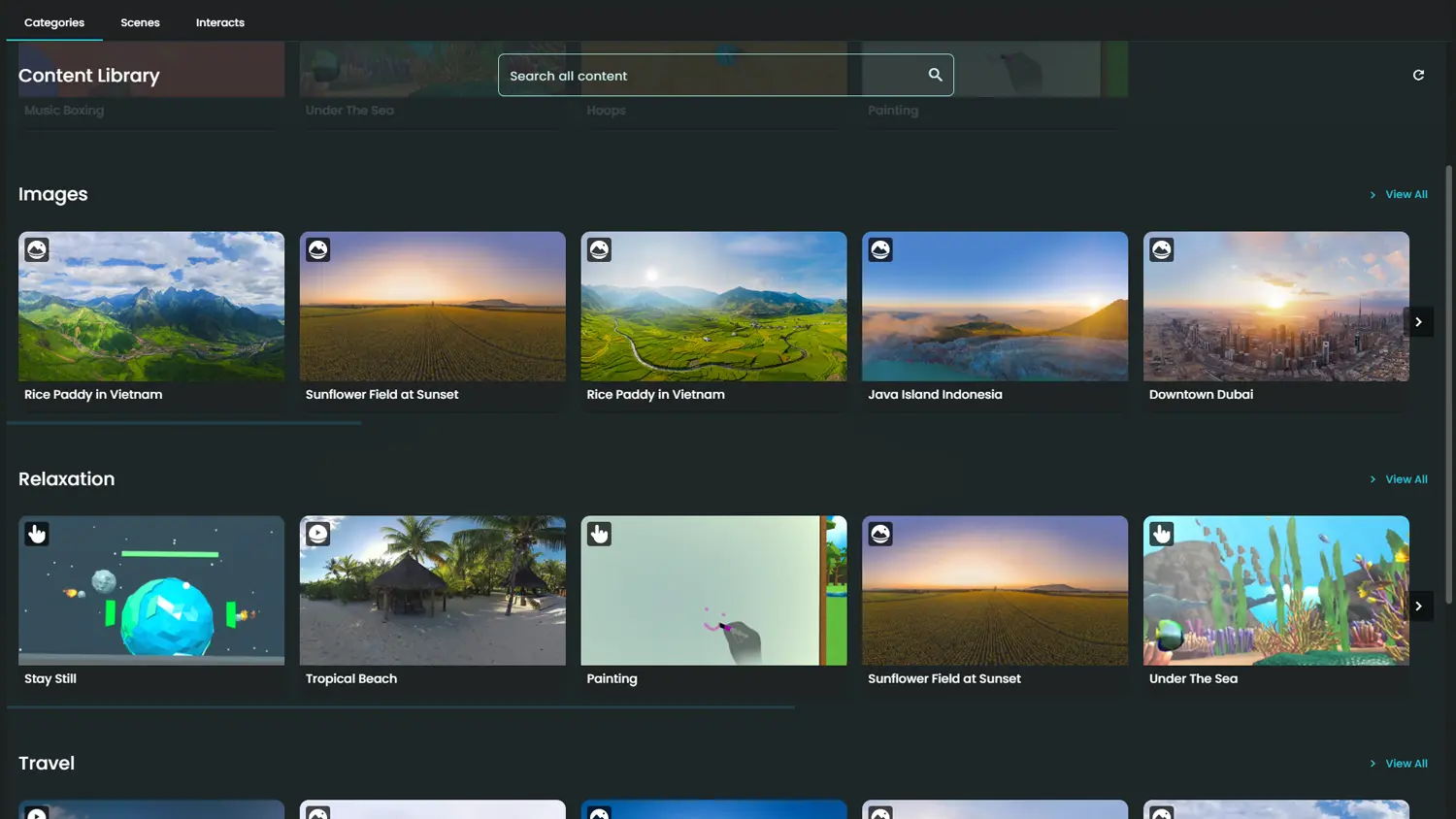 Discover a growing collection of 360° photos, videos, and interactive experiences designed for relaxation, exercise, rehabilitation, guided breathing, and more. New content is added regularly to keep your patient sessions engaging and fresh.